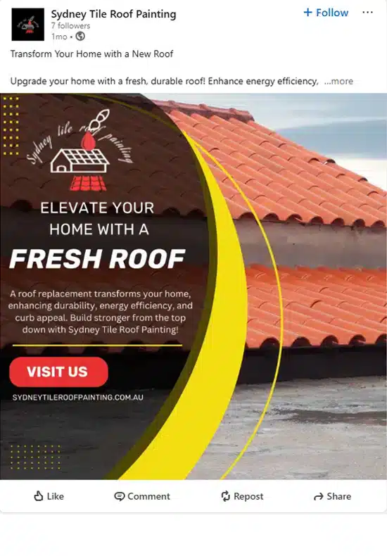 - Engaging Content: We craft eye-catching and informative social media content that resonates with Sydney Tile Roof Painting’s target audience. This could include before-and-after photos of their work, helpful tips on roof maintenance, or engaging polls about popular roofing materials.